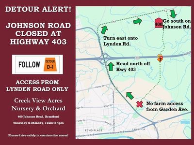 Heads up! Johnson Road is closed at Highway 403 for bridge construction. If you're planning to visit us this fall, you'll need to access the farm from the Lynden Road extension. Please see below for the map outlining the D-1 detour.
